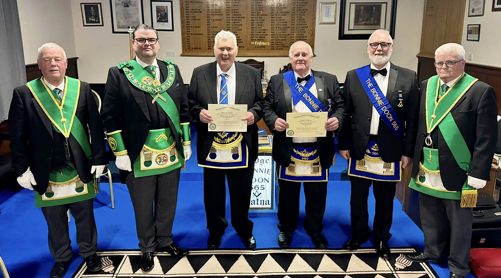 On Wednesday 25th of February 2026 Bro. Liam Stewart SPGM accompanied by a Deputation of Provincial Grand Lodge of Ayrshire Office-bearers attended Lodge The Bonnie Doon No.565 where he had the privilege of presenting a 50 year Diploma to Bro. William Rae PM & Bro. Alex Stark Snr.